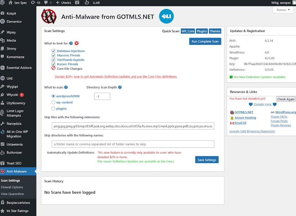 Anti-Malware Security (GOTMLS): Wykonaj pełny skan. Ta wtyczka świetnie radzi sobie z usuwaniem konkretnych skryptów wstrzykniętych w bazę danych i pliki.