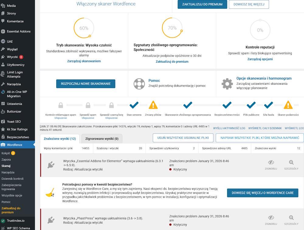 Wordfence Security: W ustawieniach skanowania wybierz „High Sensitivity”. Przeskanuj stronę i usuń lub napraw zainfekowane pliki rdzenia WordPress.